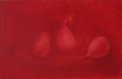 Üldisest motiivivalikust erinesid näitusel kaks punases koloriidis maali: üks kannuga ja teine kolme pirni- või õunalaadse viljaga.
